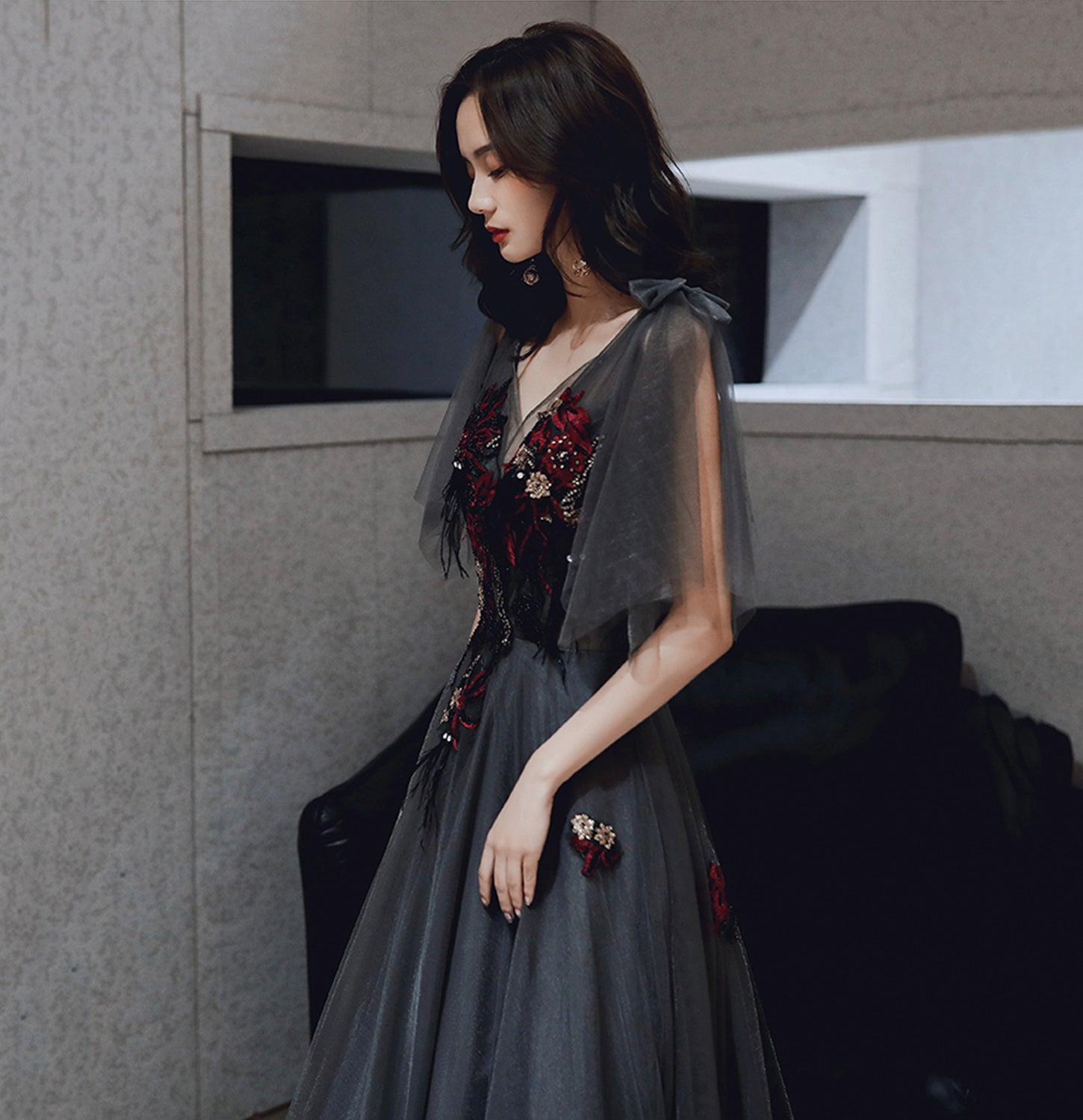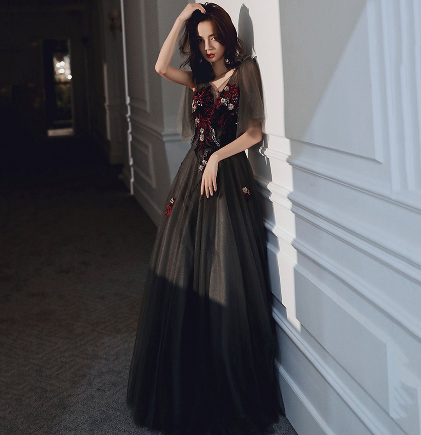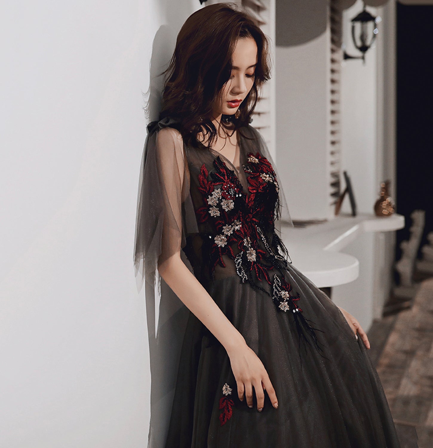 Black v neck tulle sequins long prom dress evening gown HZ1023