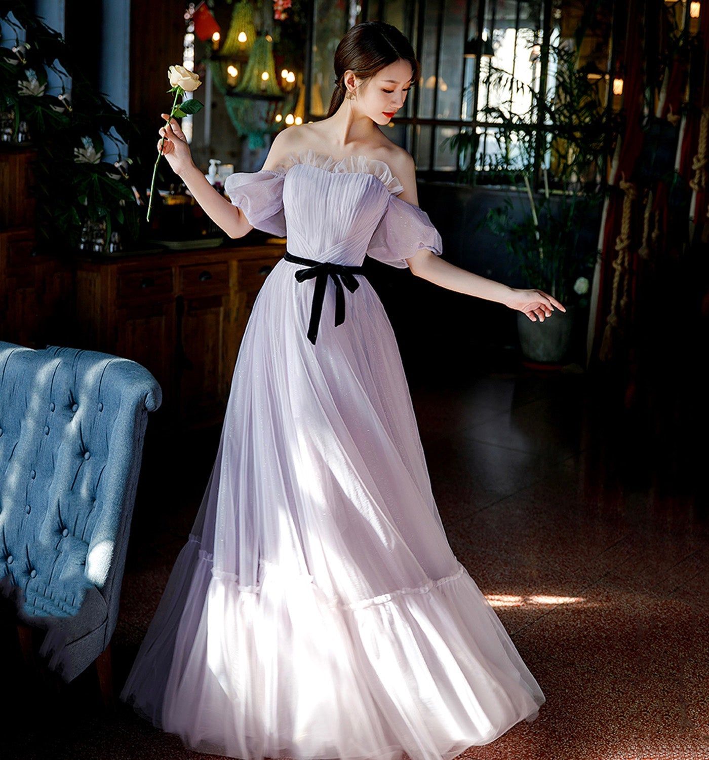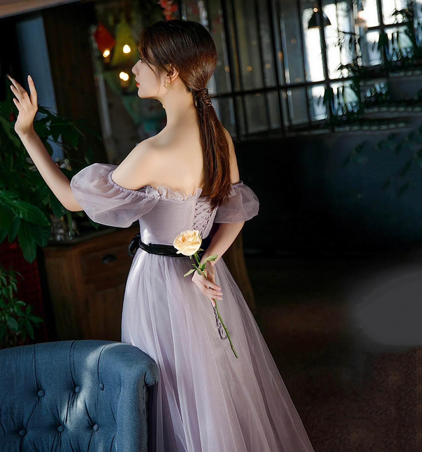 Purple tulle long A line prom gown evening gown HZ1023