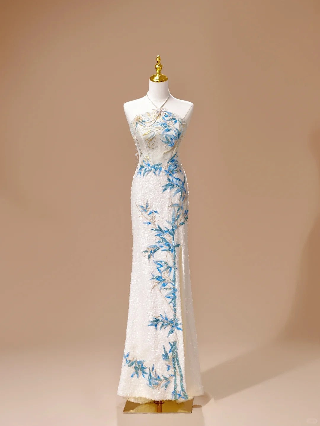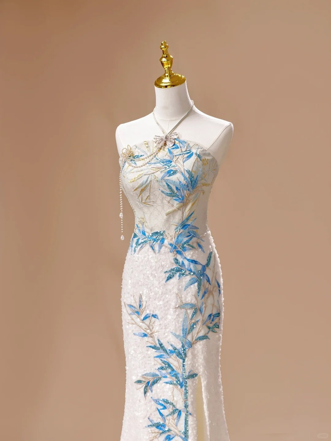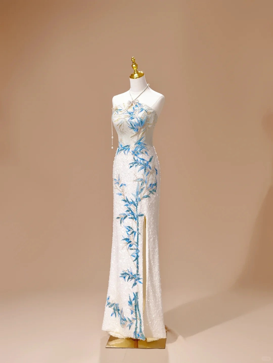 White Luxury Gorgeous Shiny Unique Fashion Elegant Exquisite Floral Bamboo Beads Sequins Suspender Long Ball Dress Evening Dress Bridal Wedding Reception Dress Prom Dress HZ1023