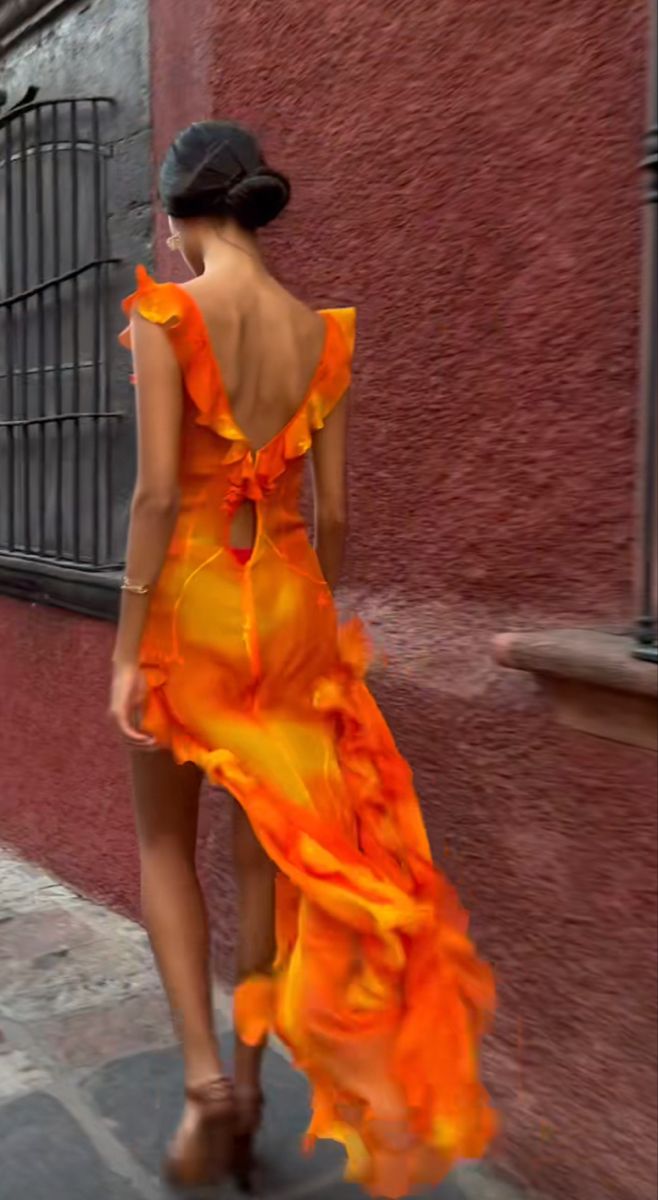 Orange Fashion Gradient Spaghetti Strap Long Ruffle Elegant Chiffon Ball Gown prom dress Evening Dress Holiday Party Dress HZ1023