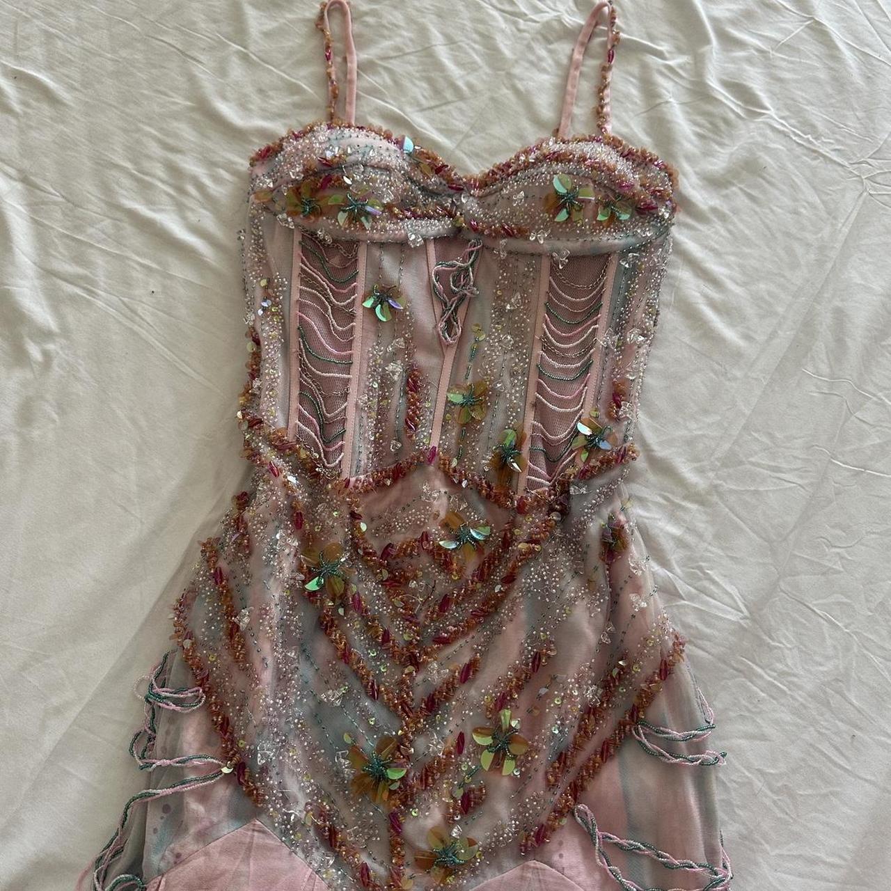 Pale Pink and Blue Flowing Vintage Fashion Mermaid Beaded Bodice Beaded with Sequins Beautiful Unique Glitter Elegant Long Chiffon Tulle Ball Gown Evening Gown Party Dress Prom Gown HZ1023