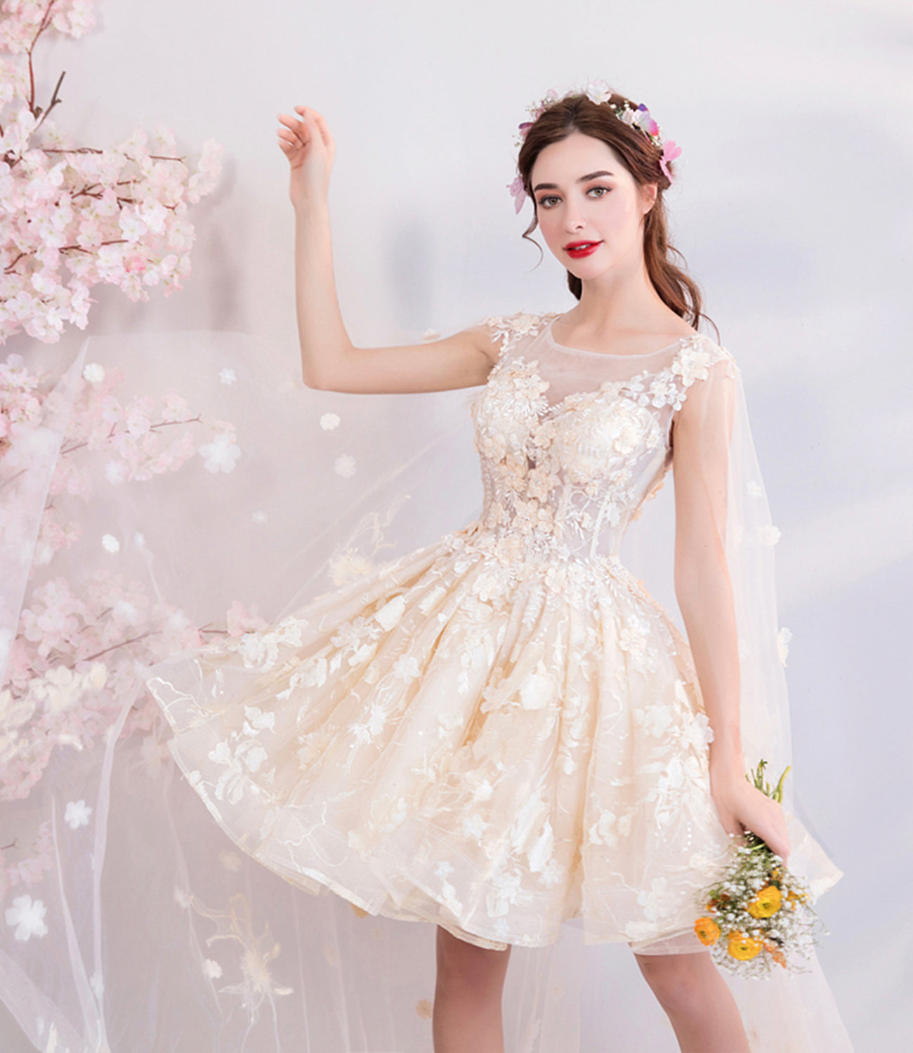 Champagne tulle lace short prom dress homecoming dress HZ1023