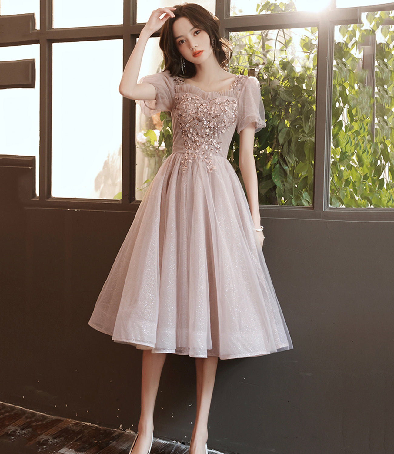 Champagne tulle sequins short prom dress homecoming dress HZ1023