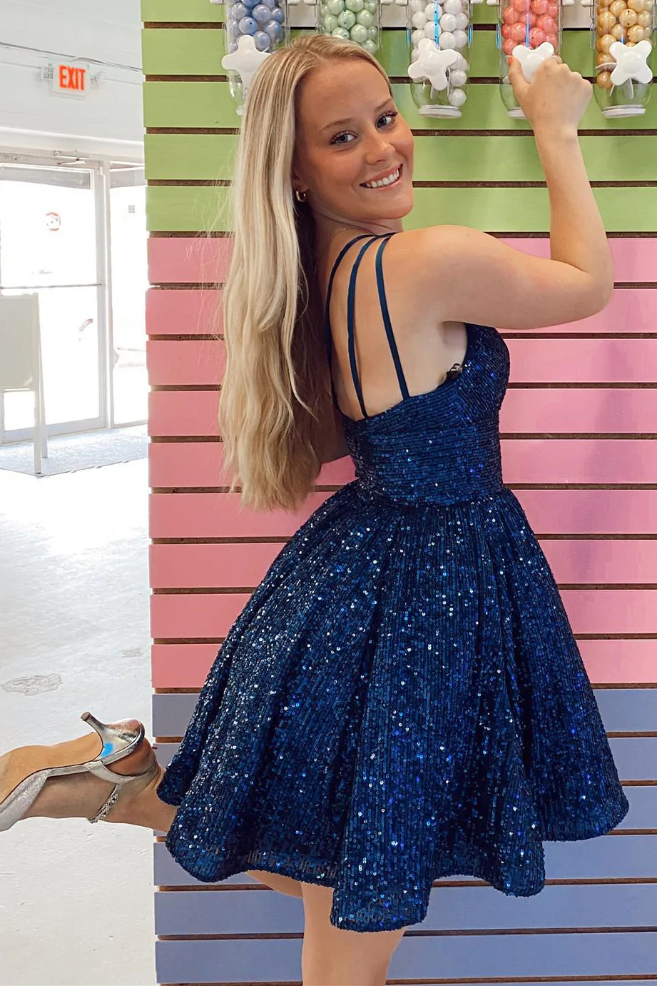 Navy Blue Sequins One-Shoulder A-Line Short Homecoming Dress HZ1023
