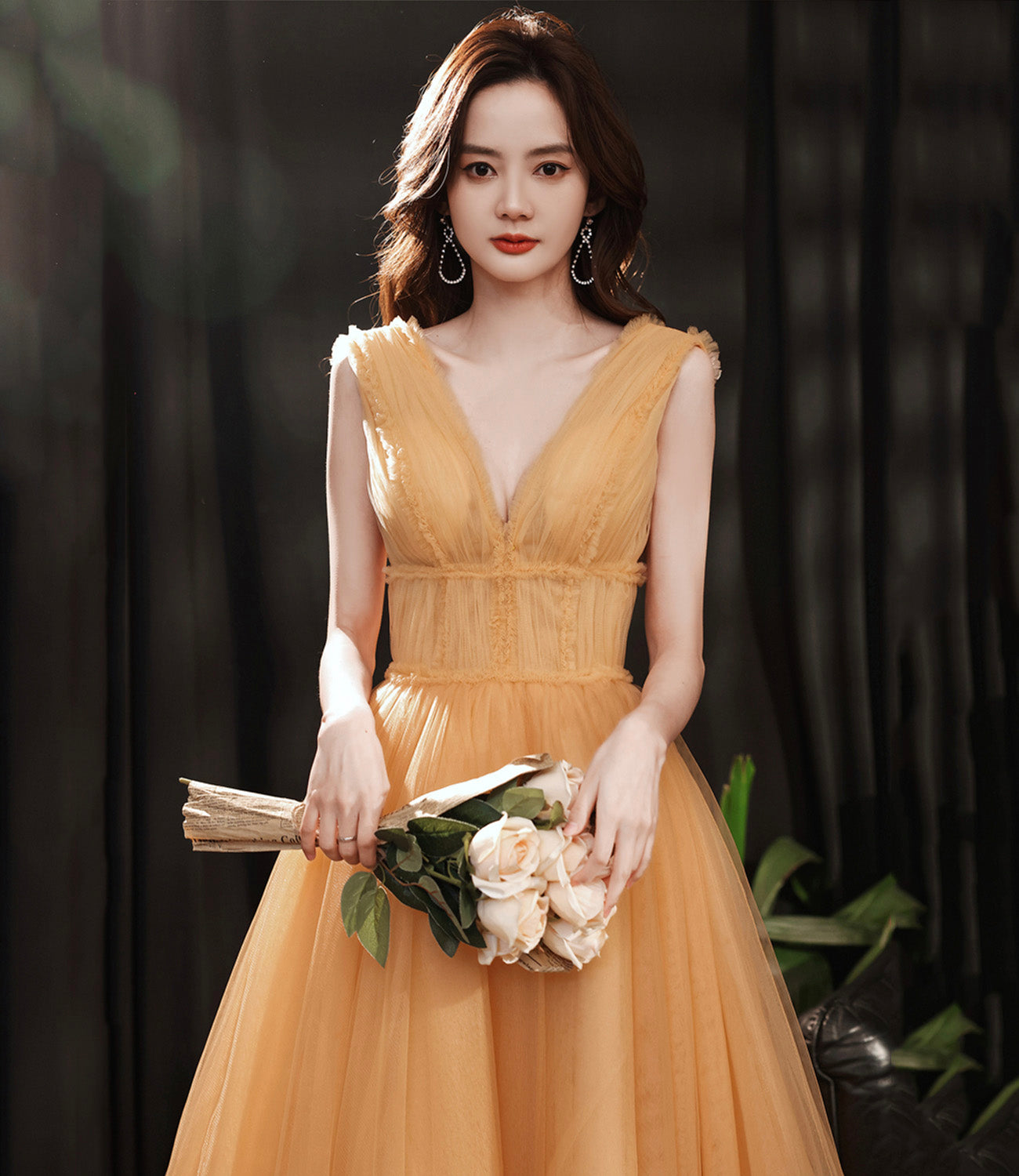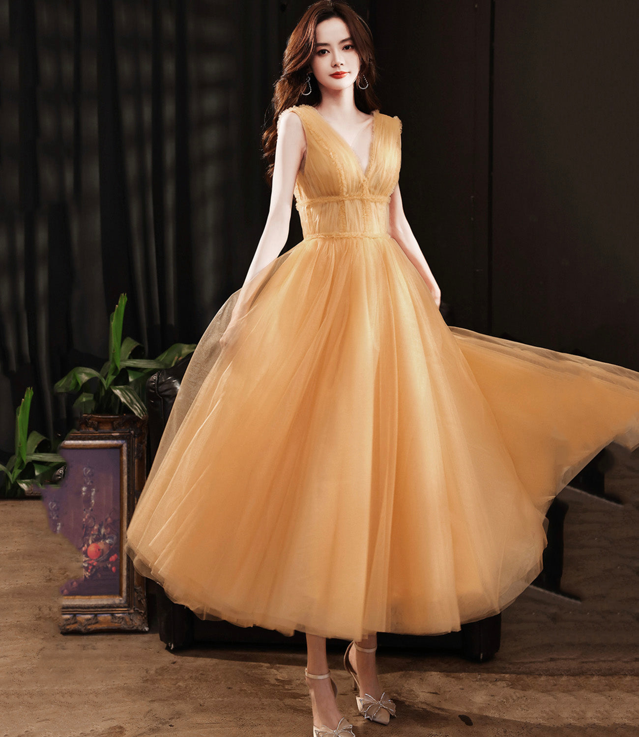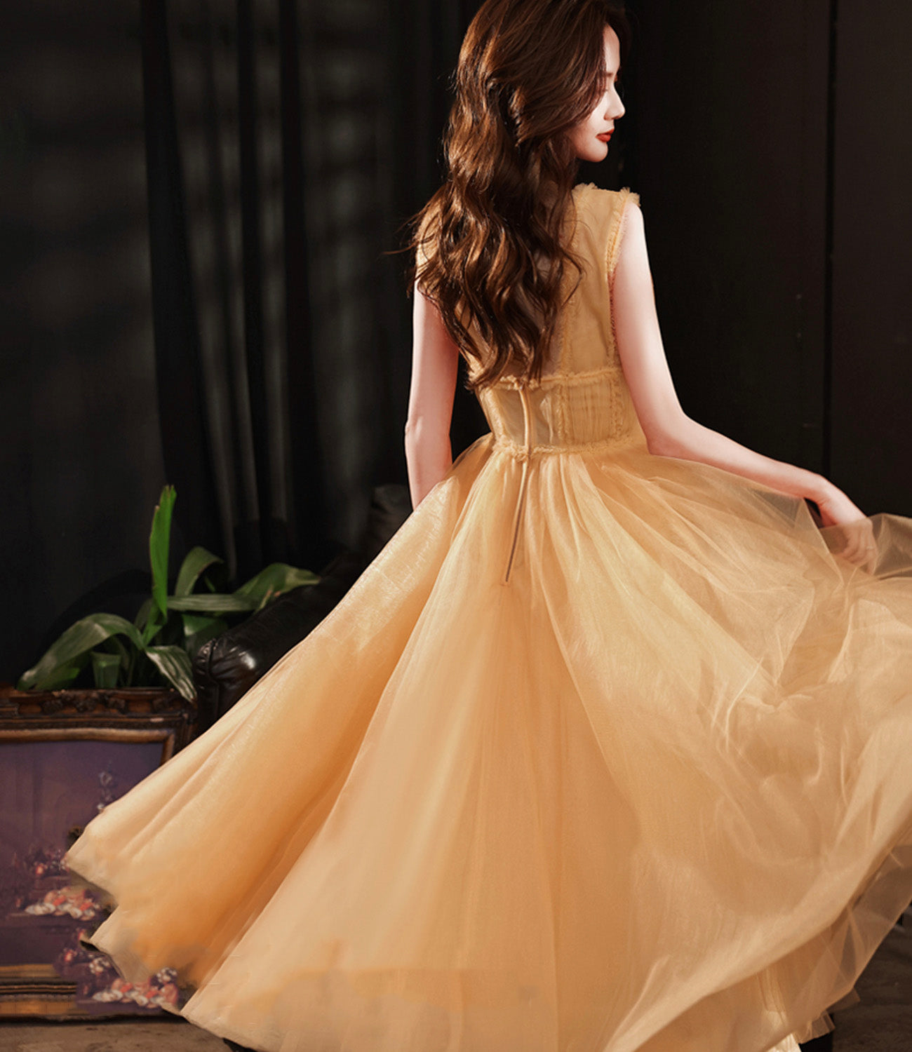 Yellow tulle short A line prom dress yellow evening dress HZ1023