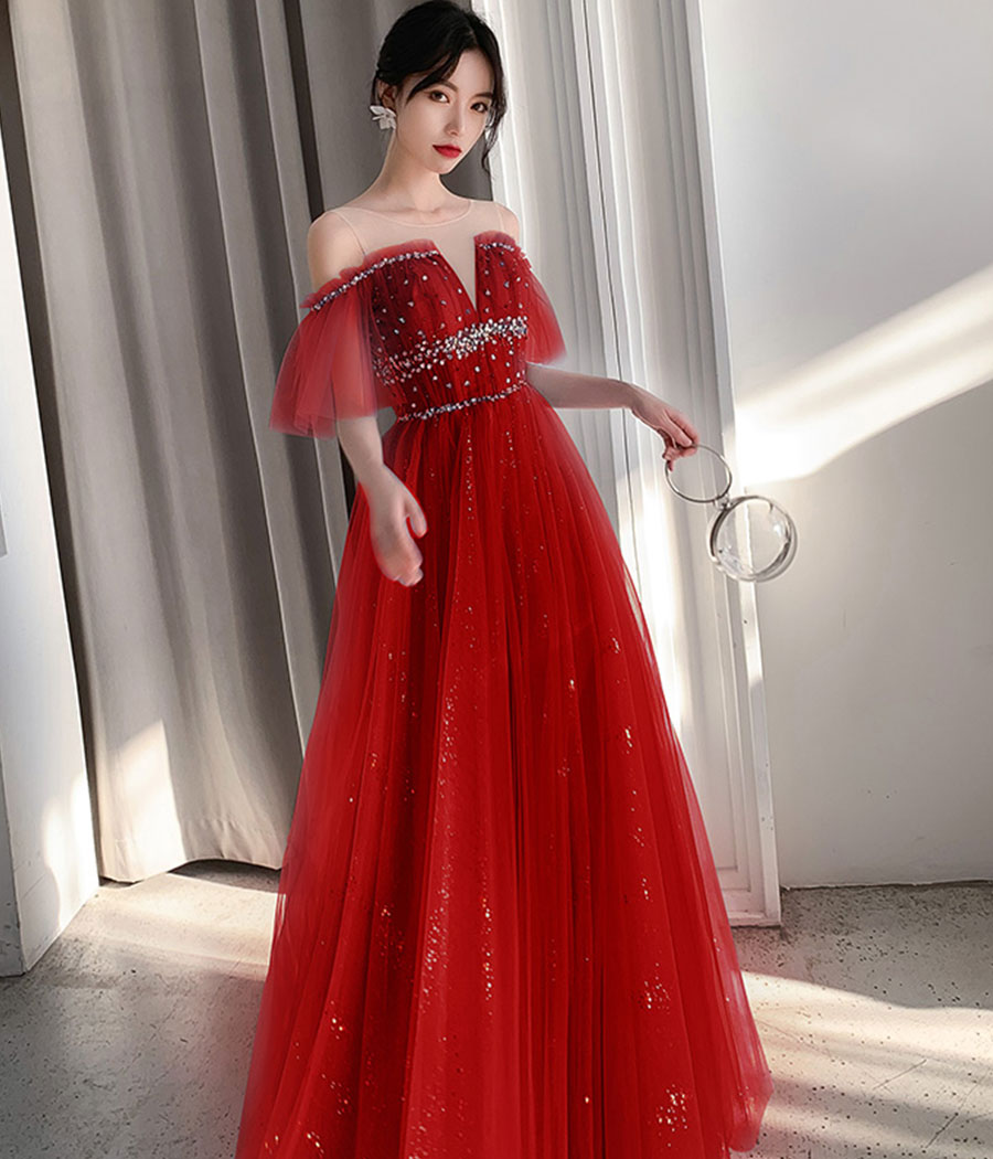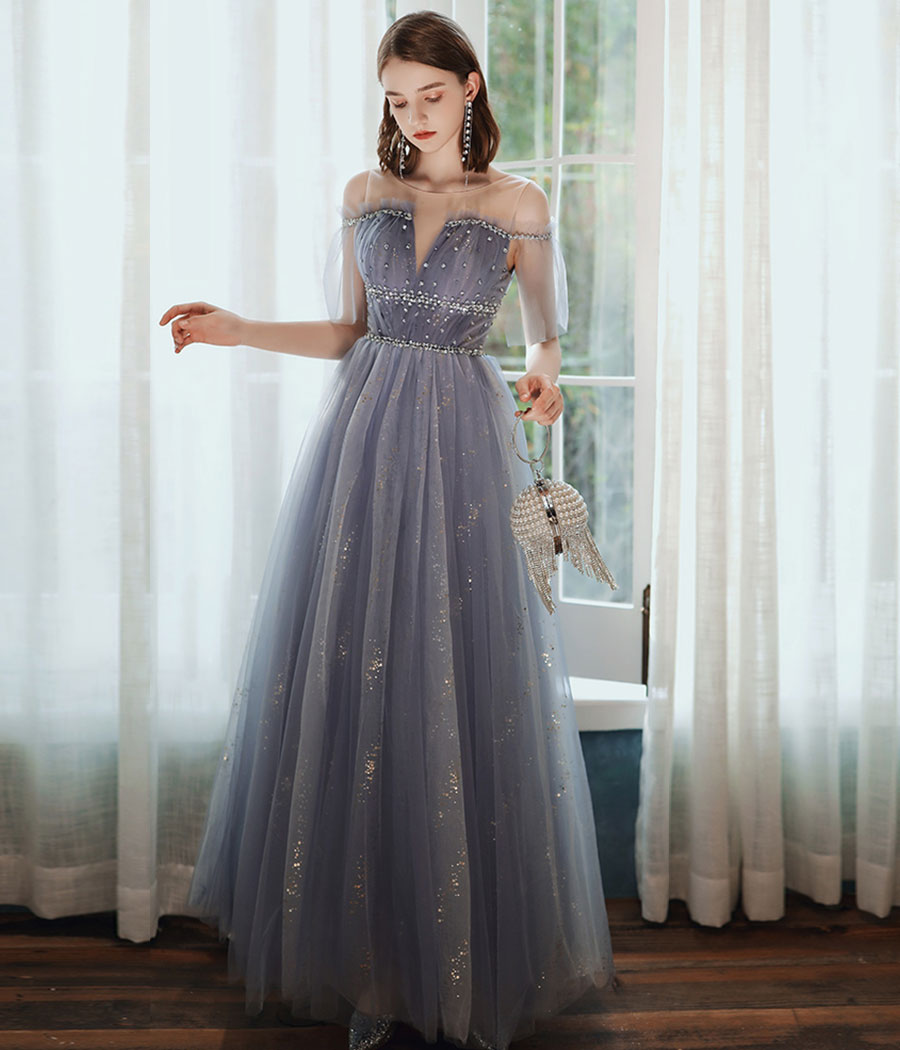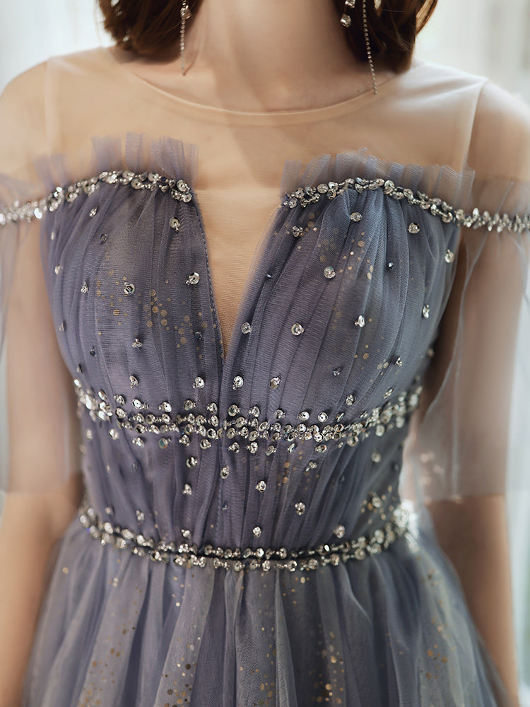 A line tulle sequins long prom dress HZ1023