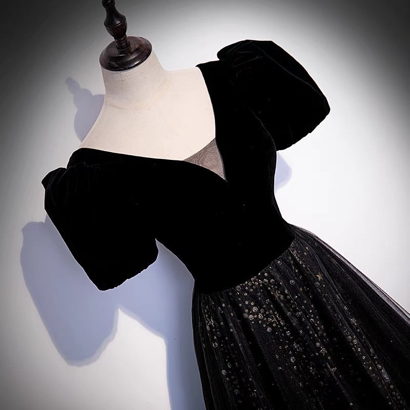 Black velvet tulle long prom dress A line evening gown HZ1023