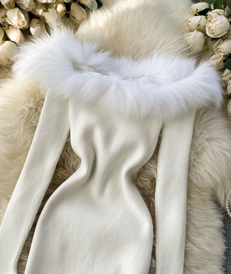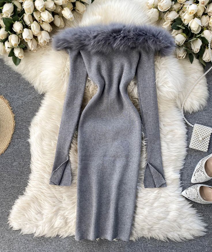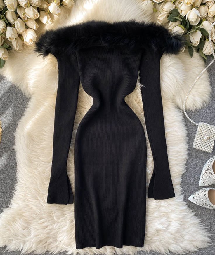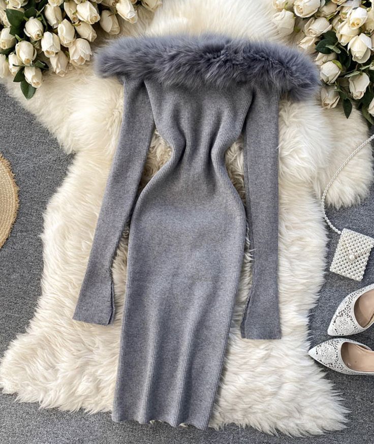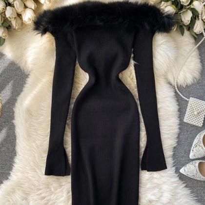 Black/white/gray autumn and winter fashion new sexy off-shoulder fashion fur collar slim hip knitted dress HZ1023
