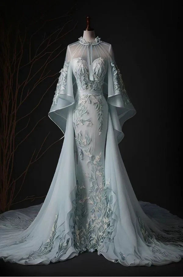 Blue Gorgeous Retro Fashion Elegant Floral Appliqu¨¦ A-Line Long Tulle Floor-Length Tail Evening Dress Prom Dress HZ1023