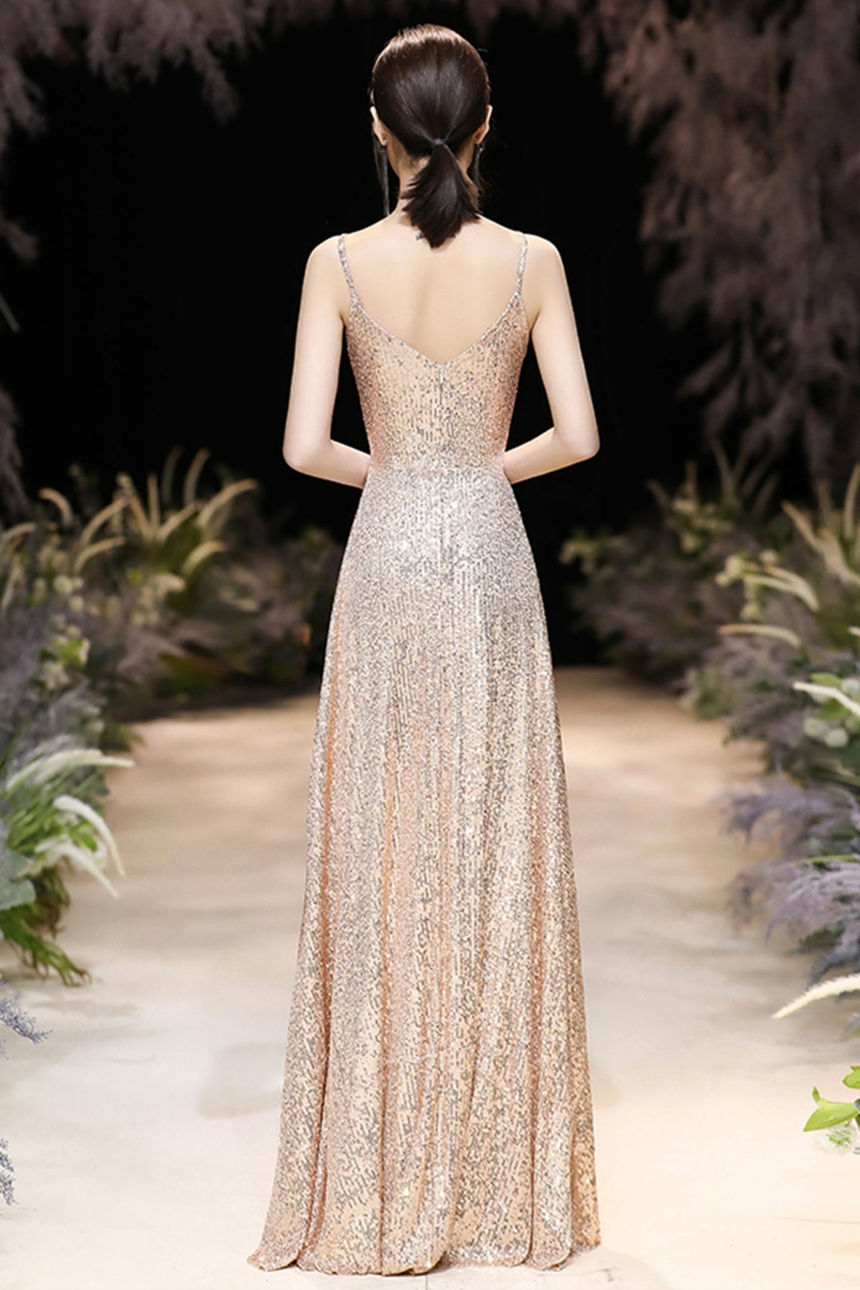 Champagne sequins long A line prom dress evening dress HZ1023
