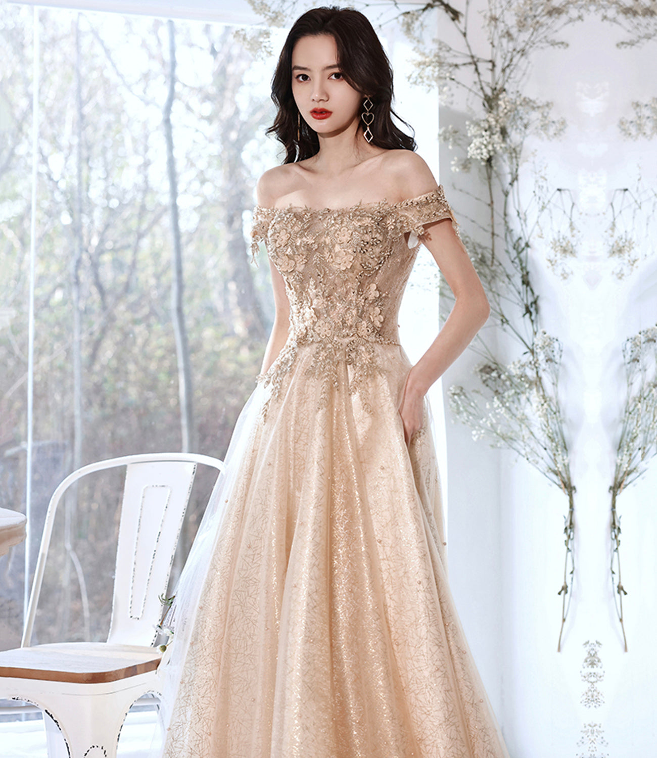 Champagne tulle lace long prom dress A line evening gown HZ1023