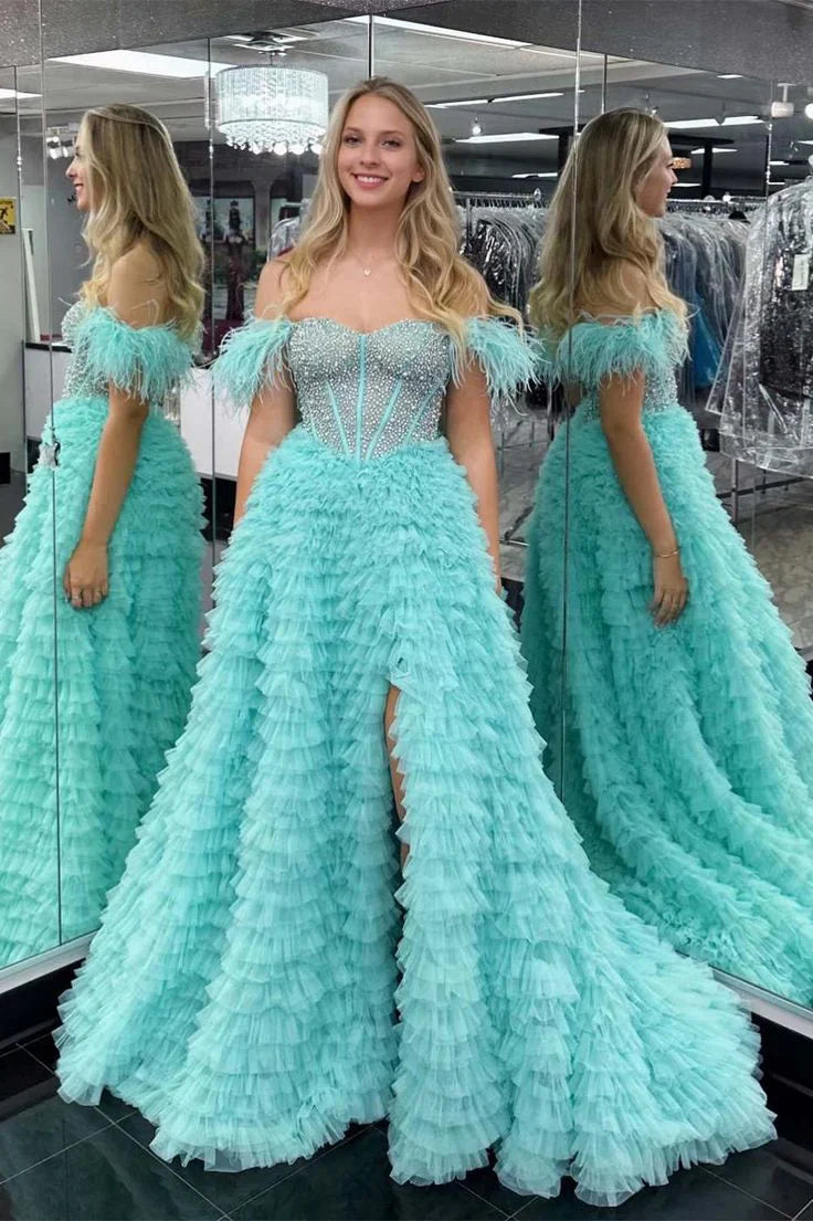 Cold Shoulder Beaded Feathers Tiered Long Prom Dress HZ1023