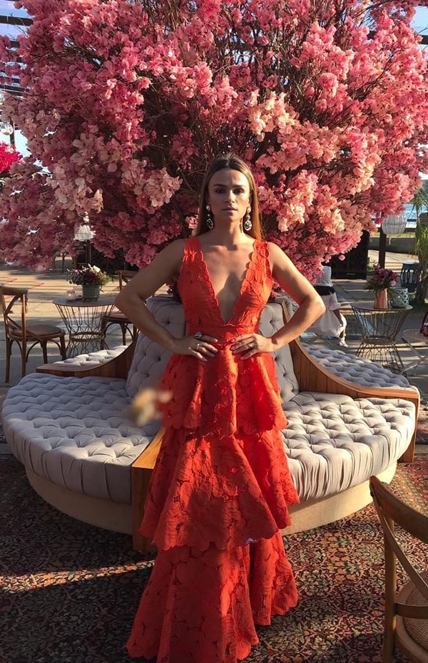 Deep V neck orange A-line long tiered ball gown evening dress HZ1023