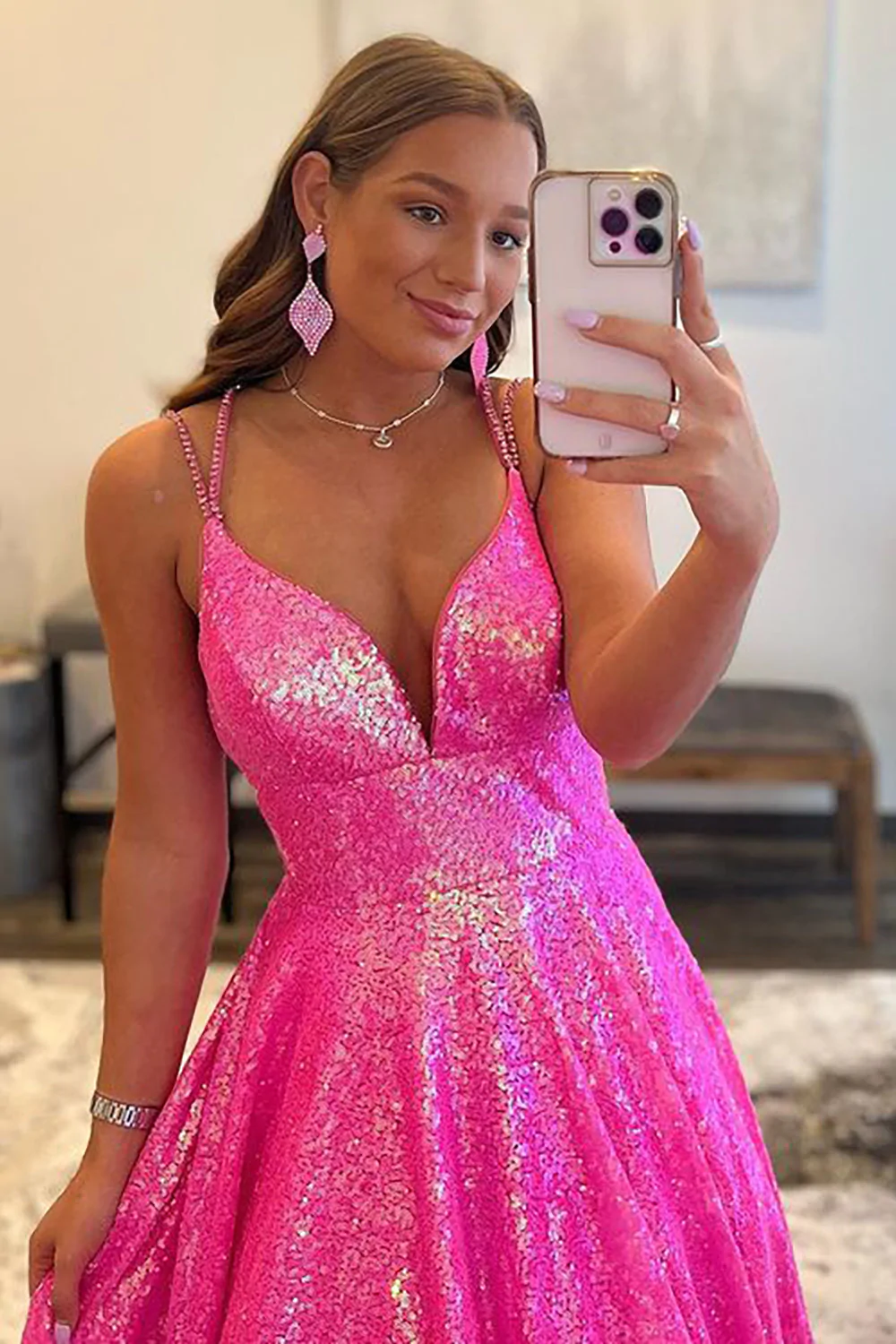 Glitter Fuchsia Sequins Long Prom Dress HZ1023