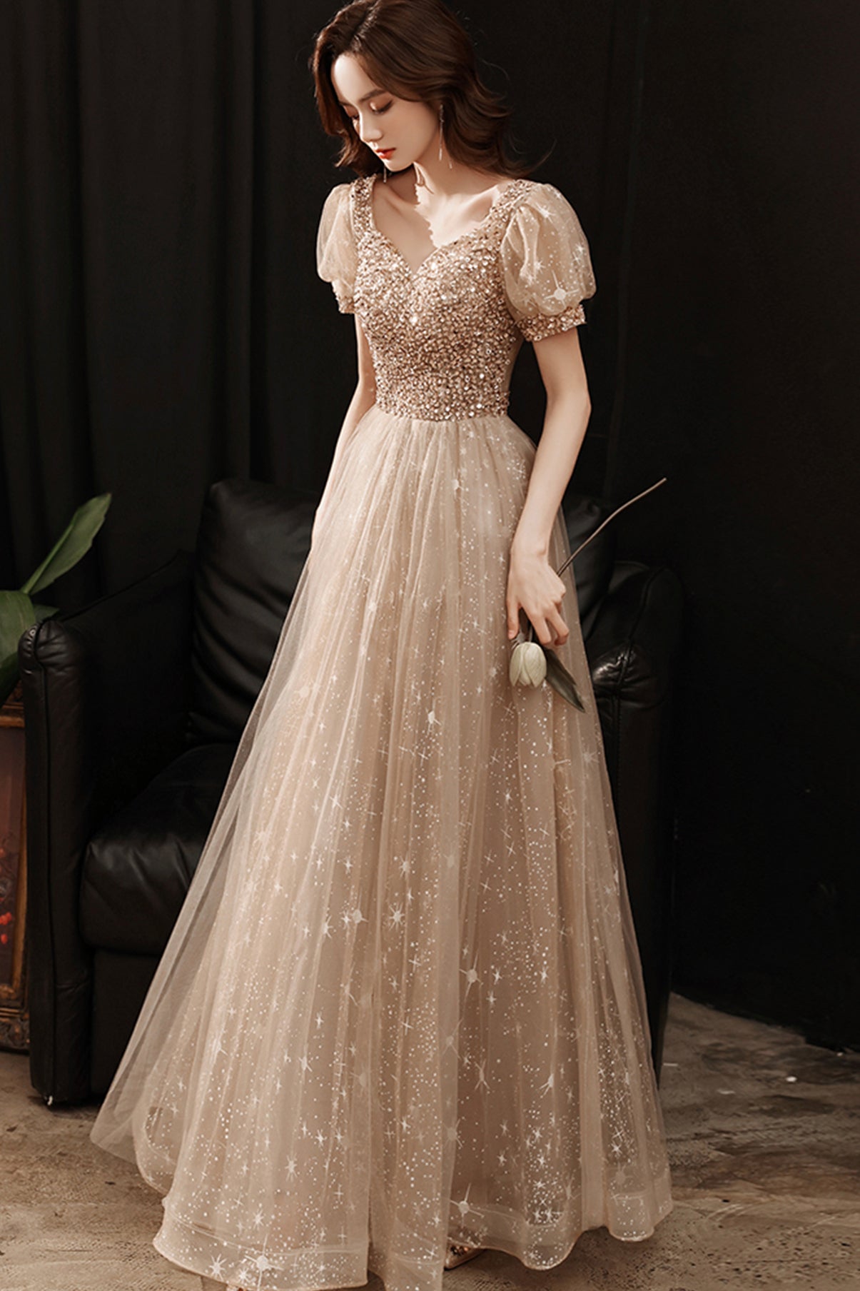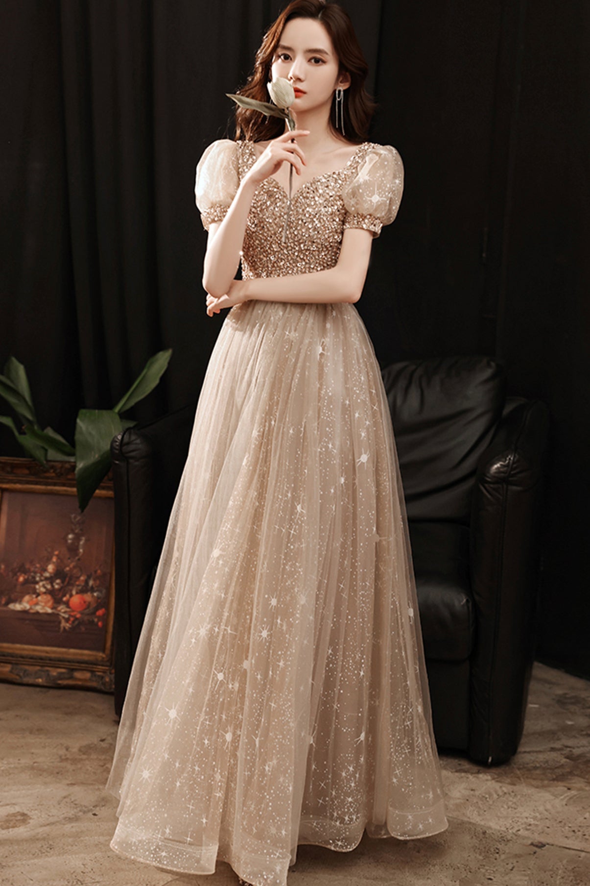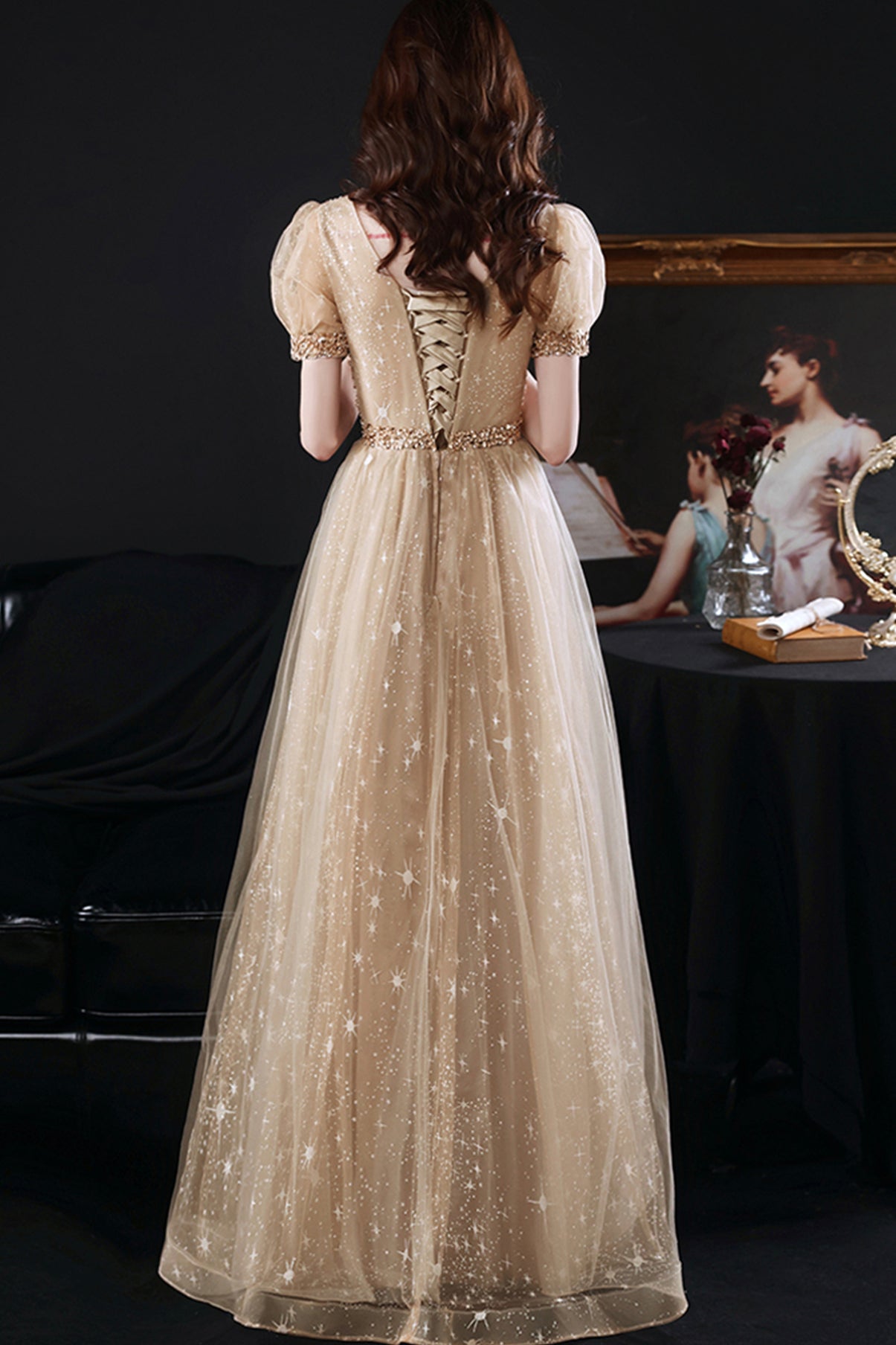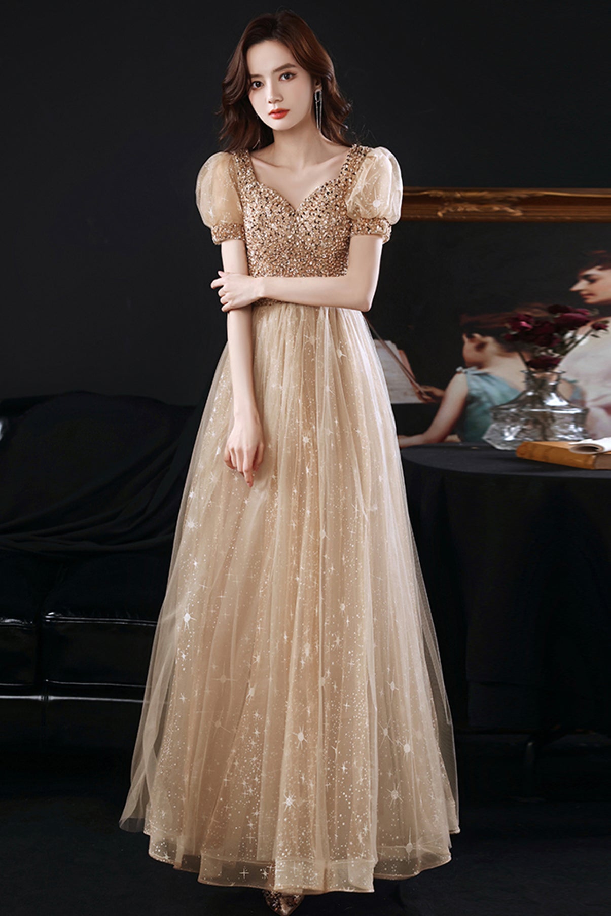 Gold tulle beads long A line prom dress evening dress HZ1023