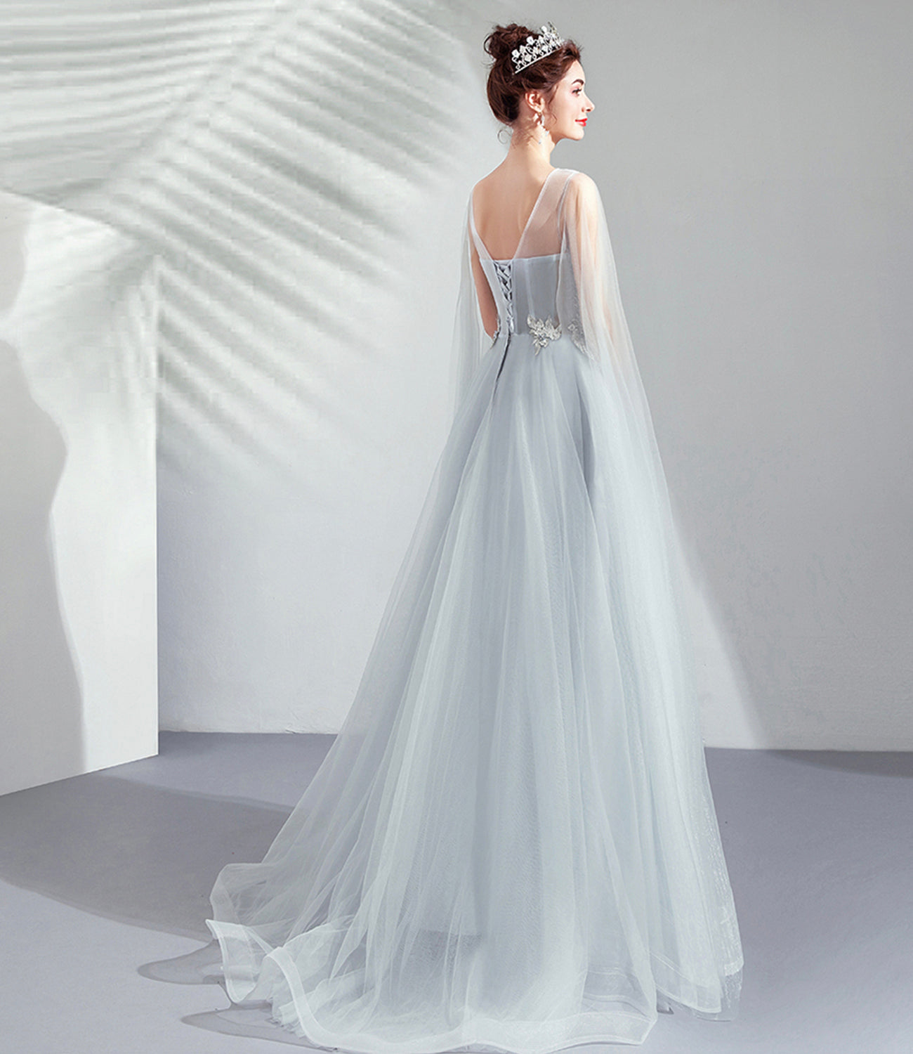 Gray tulle lace long prom dress A line evening dress HZ1023