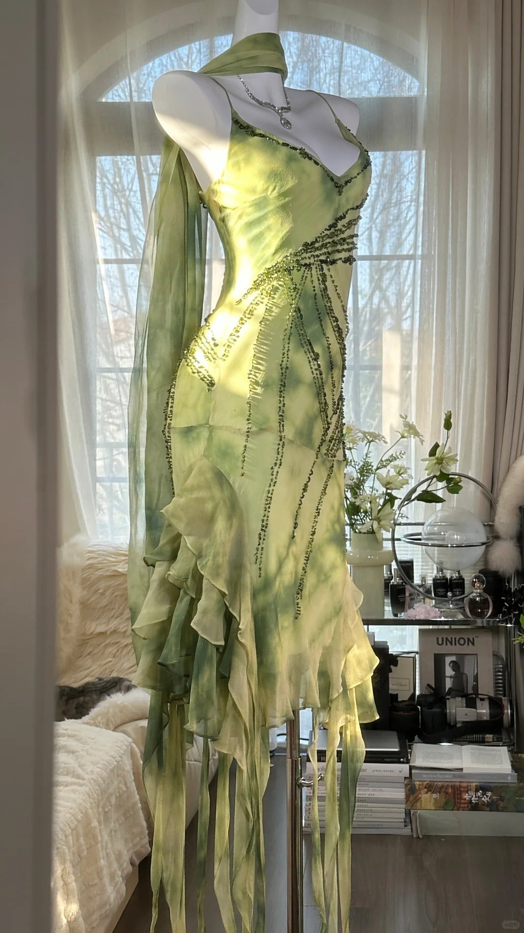 Green Romantic Elegant Exquisite Beaded Backless Long Chiffon Ruffle Homecoming Dress Prom Dress Evening Dress Birthday Vacation Party Dress HZ1023