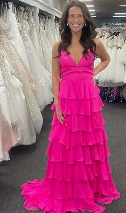 Hot Pink Spaghetti Straps Tiered Long Prom Dress HZ1023