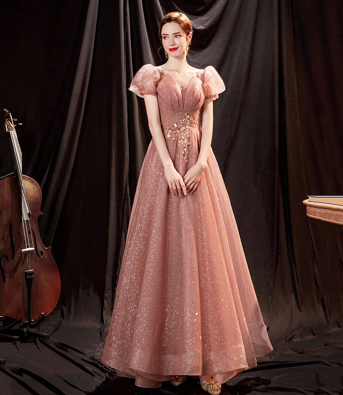 Pink tulle sequins long prom dress pink evening dress HZ1023
