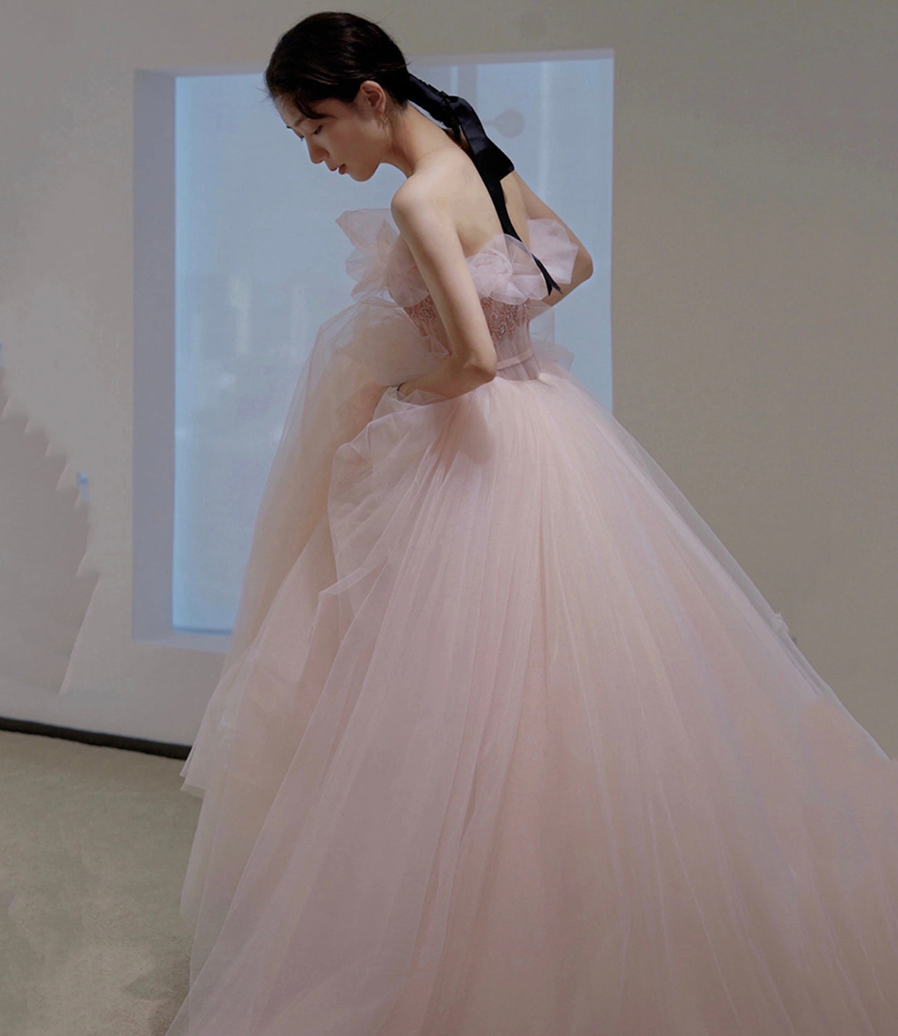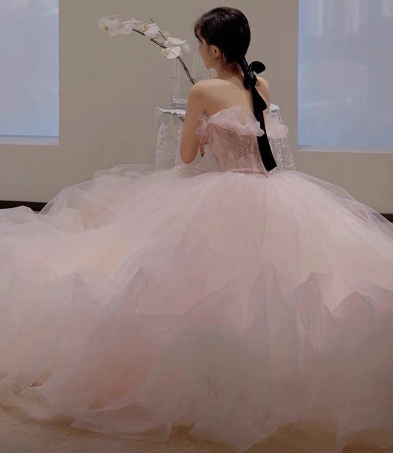 Pink tulle sequins long prom gown A line evening gown HZ1023