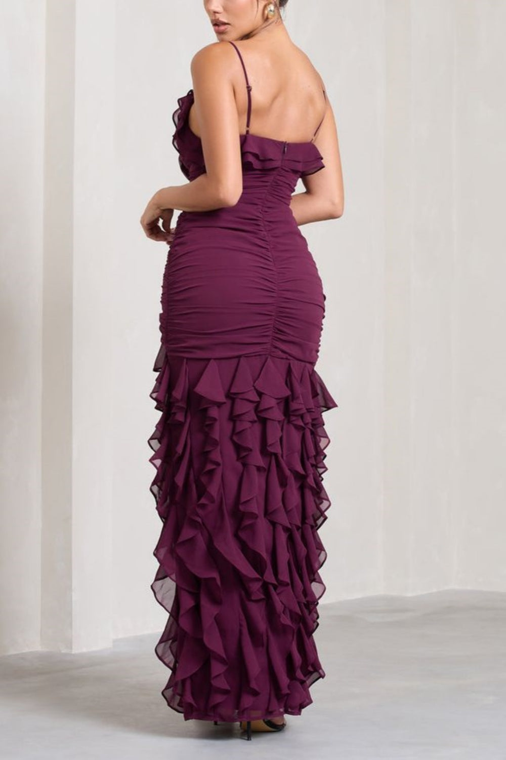 Purple Elegant Sexy Spaghetti Strap Ankle Length Chiffon Ruffle prom Evening Dress Party Dress HZ1023