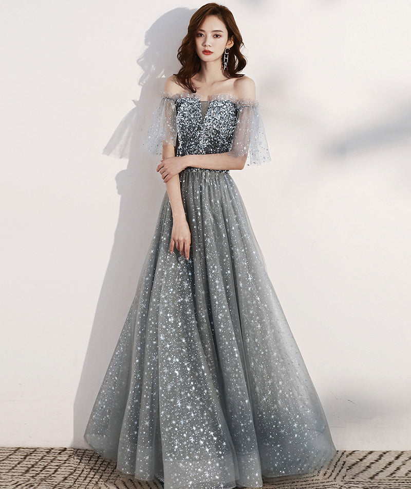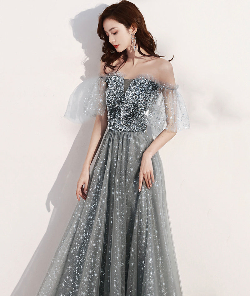 Shiny tulle long prom dress with sequins gray evening dress HZ1023