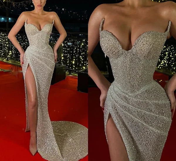 Silver shiny elegant gorgeous exquisite long sequined floor-length prom dress evening dress HZ1023