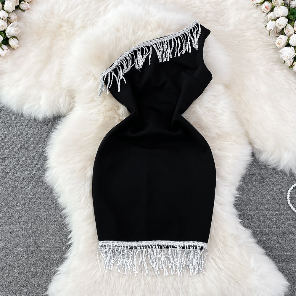 Sleeveless tassel diagonal neck Strapless Hip Wrap short dress HZ1023