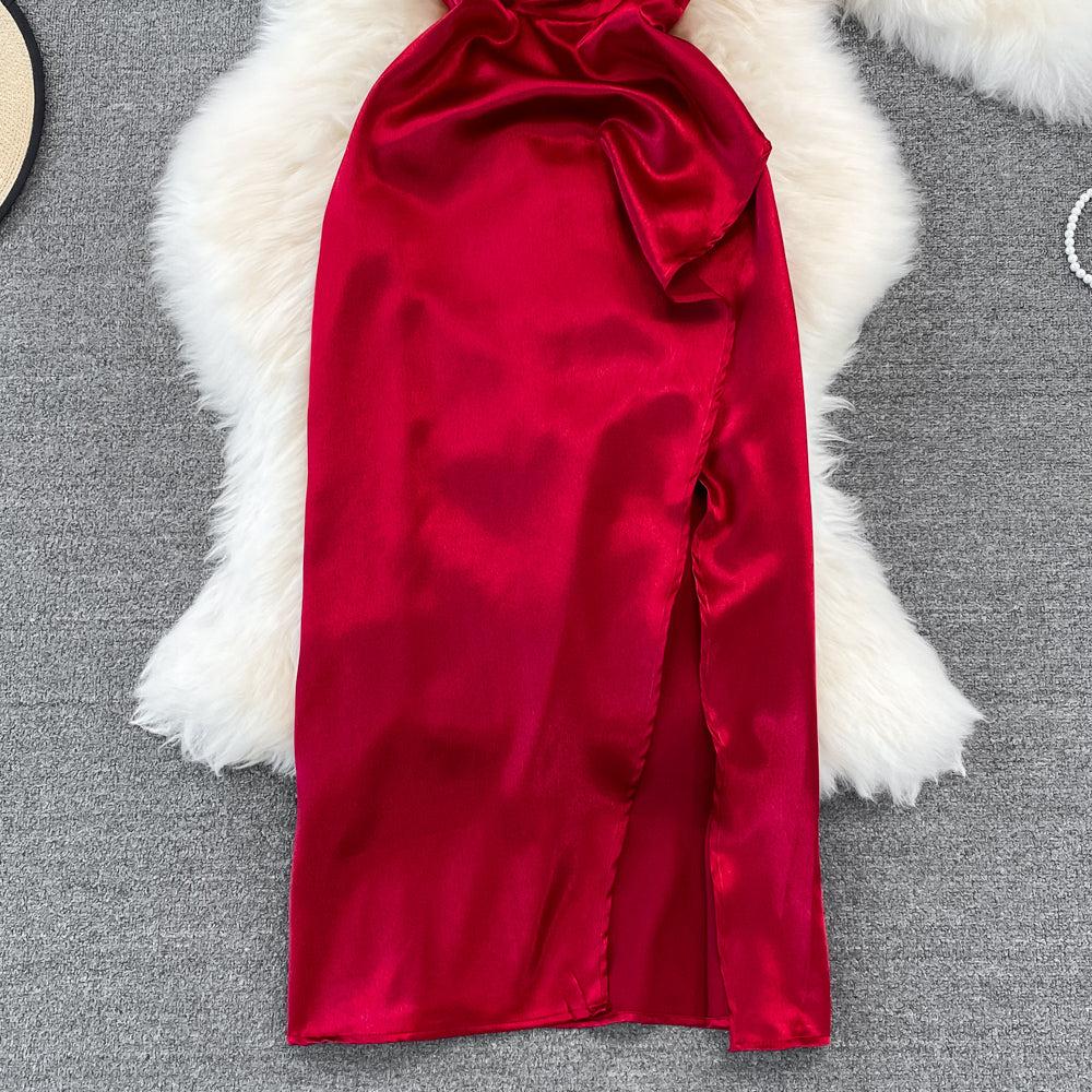 V-neck slim slim acetate Satin pleated split dress dress HZ1023